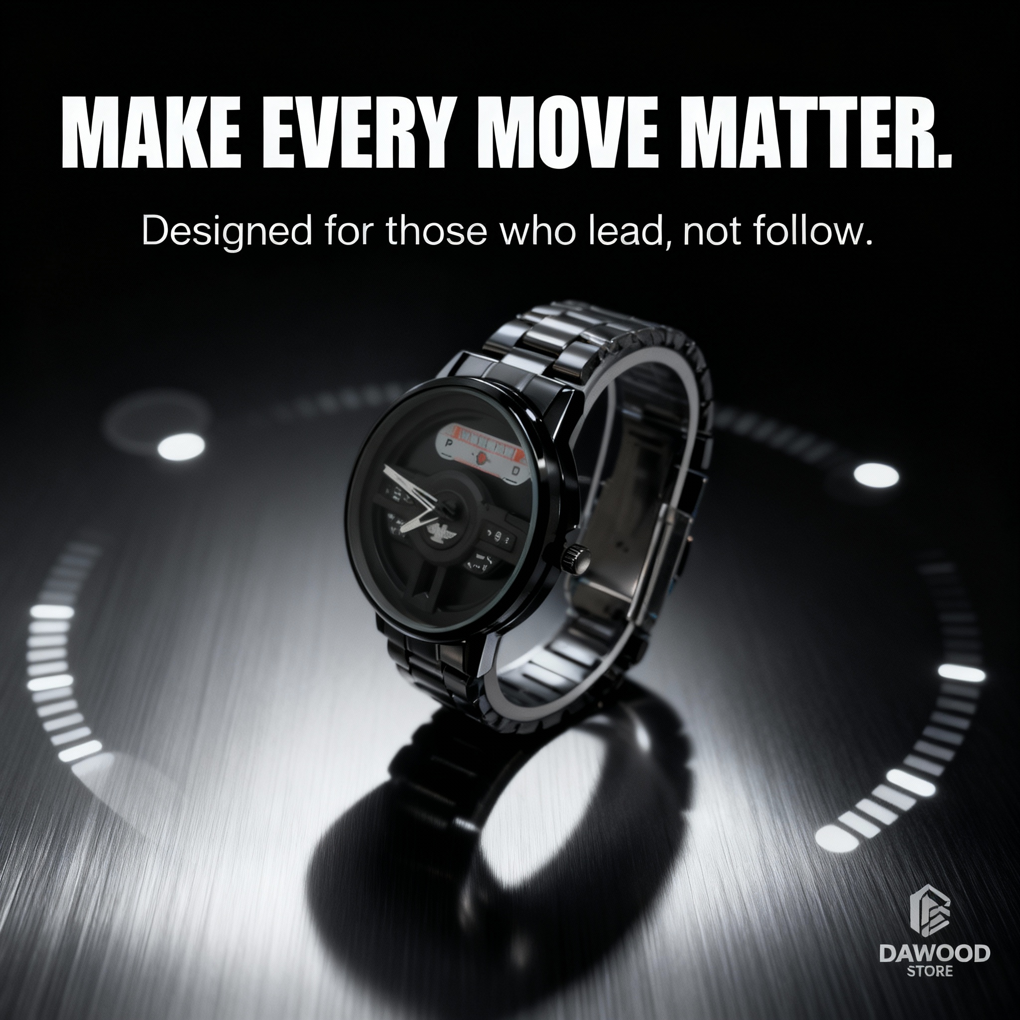 - The watch features a striking black dial with a detailed car wheel and dashboard-inspired face,